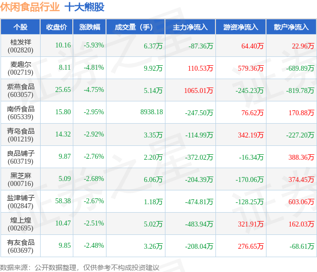 个股表示方面,休闲食物行业当日领跌股为桂发祥(002820),该股当日报收10。16,下跌5。93%,成交量6。37万,麦趣尔(002719)以下跌4。81%紧随其后,该股当日成交量9。92万,从力资金净流入110。53万元。除此之外,紫燕食物(603057)、青岛食物(001219)均进入当日熊股之列。具体个股列表见下表。
